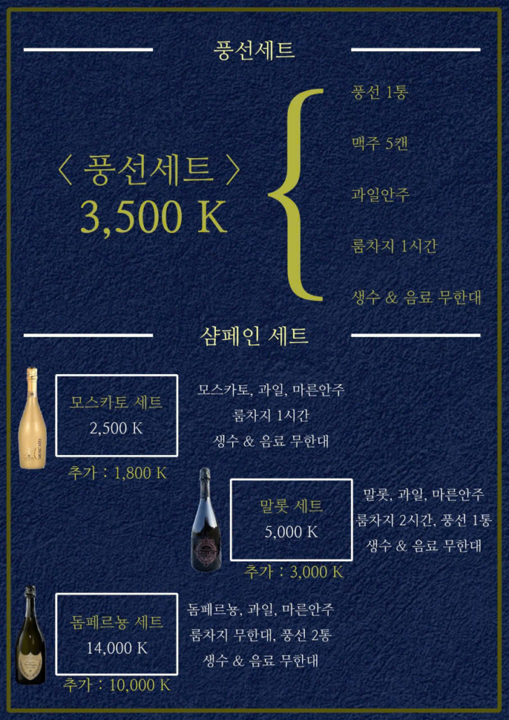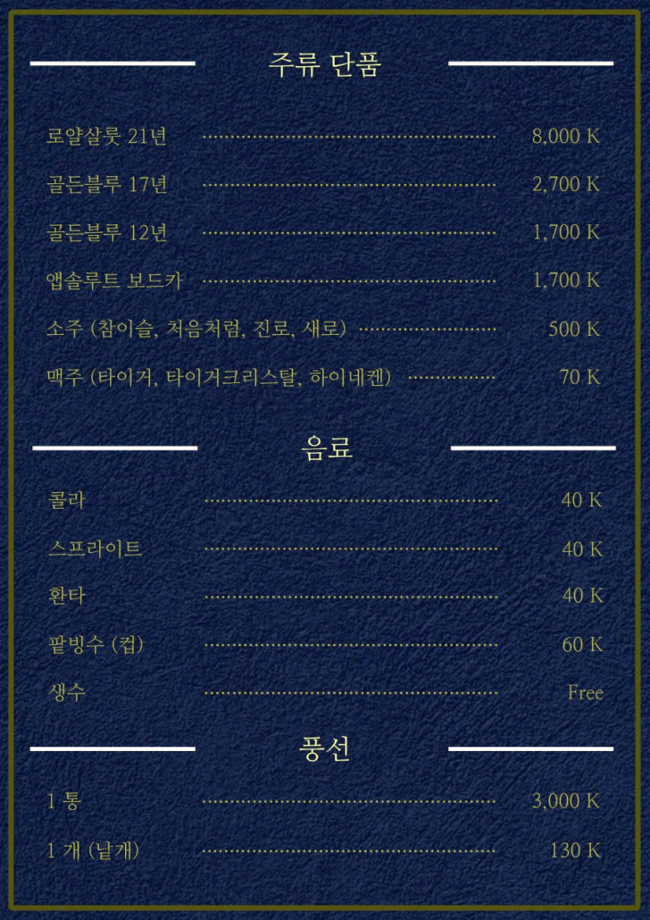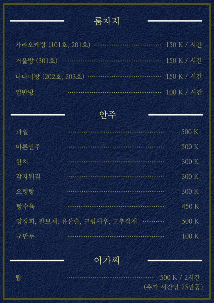 가성비: 1인 200만 동(2시간)이면 양주와 안주를 무제한